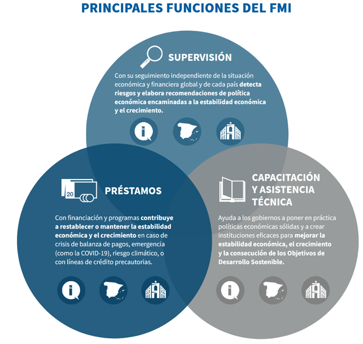 El FMI tiene tres funciones principales: supervisión, capacitación y concesión de préstamos, tal como se puede visualizar en la siguiente figura: